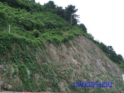GPS2主动防护网材料:采用Ø8的钢丝绳(抗拉强度为1770Mpa,破断拉力>40KN)编制并在结点处用专用“十字扣”固定而成,为防护网的主要特征构件之一,在主动防护系统中通过钢丝绳网的覆盖来实现边坡的加固,其开放特征可以实现对坡面天然植被和植被生长条件的最佳保护,实现环境保护与灾害治理的有机结合;在被动防护系统中,其柔性特征充分体现了“以柔克刚”的思想,实现崩塌落石的有效拦截。GPS2主动防护网是现代应用最为普遍的一种